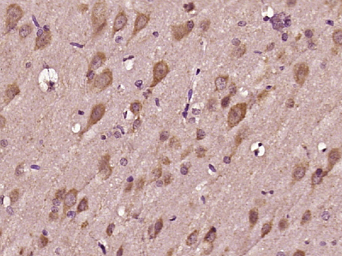 Paraformaldehyde-fixed, paraffin embedded (Rat brain); Antigen retrieval by boiling in sodium citrate buffer (pH6.0) for 15min; Block endogenous peroxidase by 3% hydrogen peroxide for 20 minutes; Blocking buffer (normal goat serum) at 37°C for 30min; Antibody incubation with (RNF142) Polyclonal Antibody, Unconjugated (bs-9156R) at 1:400 overnight at 4°C, followed by operating according to SP Kit(Rabbit) (sp-0023) instructionsand DAB staining.