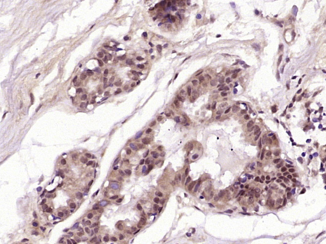 Paraformaldehyde-fixed, paraffin embedded (human breast carcinoma); Antigen retrieval by boiling in sodium citrate buffer (pH6.0) for 15min; Block endogenous peroxidase by 3% hydrogen peroxide for 20 minutes; Blocking buffer (normal goat serum) at 37°C for 30min; Antibody incubation with (PIBF1) Polyclonal Antibody, Unconjugated (bs-9612R) at 1:400 overnight at 4°C, followed by operating according to SP Kit(Rabbit) (sp-0023) instructionsand DAB staining.