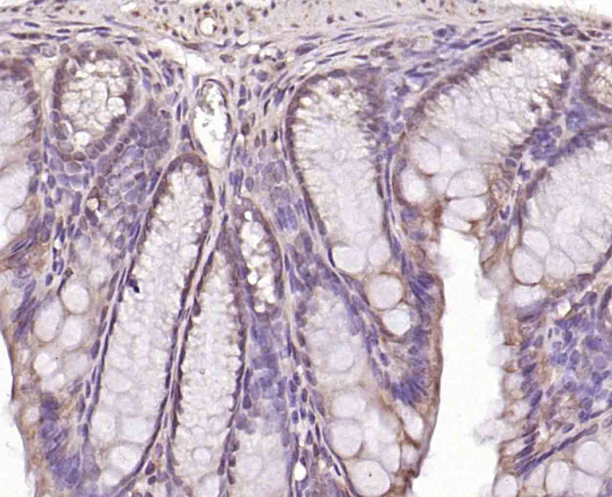 Paraformaldehyde-fixed, paraffin embedded (mouse colon); Antigen retrieval by boiling in sodium citrate buffer (pH6.0) for 15min; Block endogenous peroxidase by 3% hydrogen peroxide for 20 minutes; Blocking buffer (normal goat serum) at 37°C for 30min; Incubation with (SFRS3) Polyclonal Antibody, Unconjugated (bs-17299R) at 1:200 overnight at 4°C, followed by operating according to SP Kit(Rabbit) (sp-0023) instructionsand DAB staining.