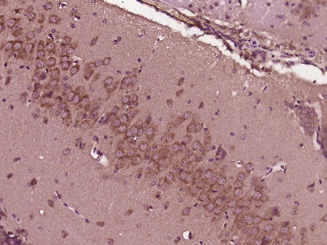 Paraformaldehyde-fixed, paraffin embedded (Mouse brain); Antigen retrieval by boiling in sodium citrate buffer (pH6.0) for 15min; Block endogenous peroxidase by 3% hydrogen peroxide for 20 minutes; Blocking buffer (normal goat serum) at 37°C for 30min; Antibody incubation with (MTMR12) Polyclonal Antibody, Unconjugated (bs-17884R) at 1:500 overnight at 4°C, followed by a conjugated secondary (sp-0023) for 20 minutes and DAB staining.
