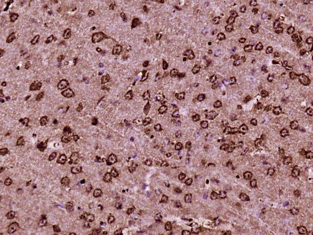 Paraformaldehyde-fixed, paraffin embedded (Mouse brain); Antigen retrieval by boiling in sodium citrate buffer (pH6.0) for 15min; Block endogenous peroxidase by 3% hydrogen peroxide for 20 minutes; Blocking buffer (normal goat serum) at 37°C for 30min; Antibody incubation with (RhoF) Polyclonal Antibody, Unconjugated (bs-19874R) at 1:400 overnight at 4°C, followed by operating according to SP Kit(Rabbit) (sp-0023) instructionsand DAB staining.