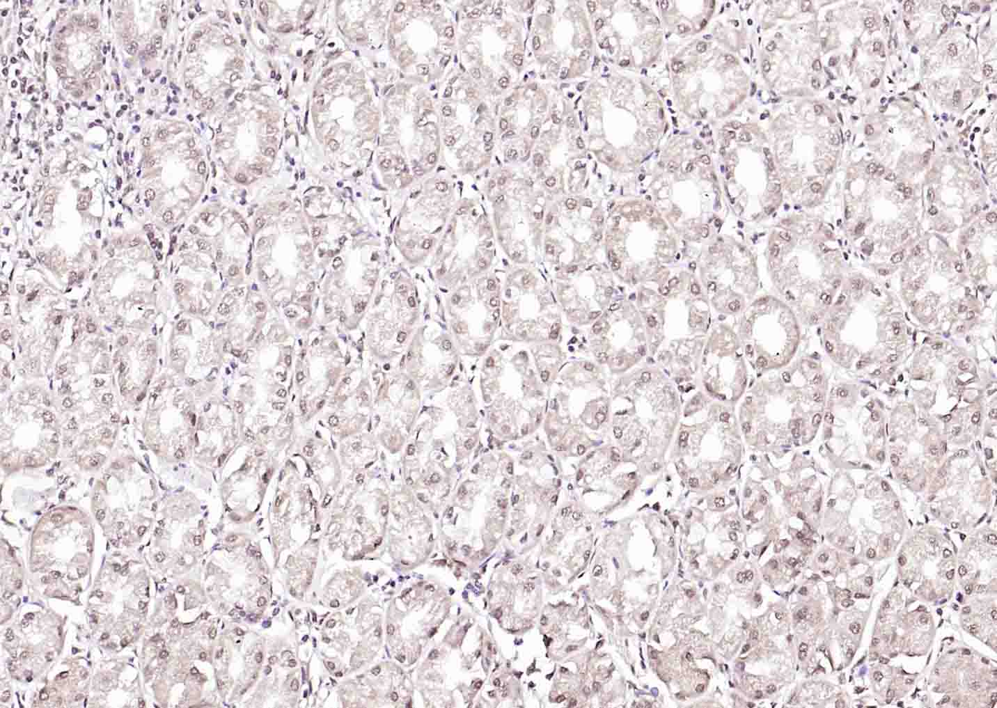 Paraformaldehyde-fixed, paraffin embedded (human stomach); Antigen retrieval by boiling in sodium citrate buffer (pH6.0) for 15min; Block endogenous peroxidase by 3% hydrogen peroxide for 20 minutes; Blocking buffer (normal goat serum) at 37°C for 30min; Incubation with (PURB) Polyclonal Antibody, Unconjugated (bs-4435R) at 1:200 overnight at 4°C, followed by operating according to SP Kit(Rabbit) (sp-0023) instructionsand DAB staining.