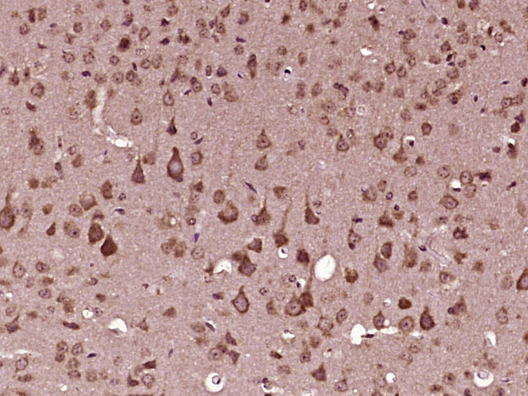 Paraformaldehyde-fixed, paraffin embedded (mouse brain tissue); Antigen retrieval by boiling in sodium citrate buffer (pH6.0) for 15min; Block endogenous peroxidase by 3% hydrogen peroxide for 20 minutes; Blocking buffer (normal goat serum) at 37°C for 30min; Antibody incubation with (RAPGEFL1) Polyclonal Antibody, Unconjugated (bs-21157R) at 1:400 overnight at 4°C, followed by operating according to SP Kit(Rabbit) (sp-0023) instructionsand DAB staining.