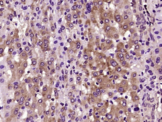 Paraformaldehyde-fixed, paraffin embedded (human liver carcinoma); Antigen retrieval by boiling in sodium citrate buffer (pH6.0) for 15min; Block endogenous peroxidase by 3% hydrogen peroxide for 20 minutes; Blocking buffer (normal goat serum) at 37°C for 30min; Antibody incubation with (CCL15) Polyclonal Antibody, Unconjugated (bs-20465R) at 1:400 overnight at 4°C, followed by operating according to SP Kit(Rabbit) (sp-0023) instructionsand DAB staining.