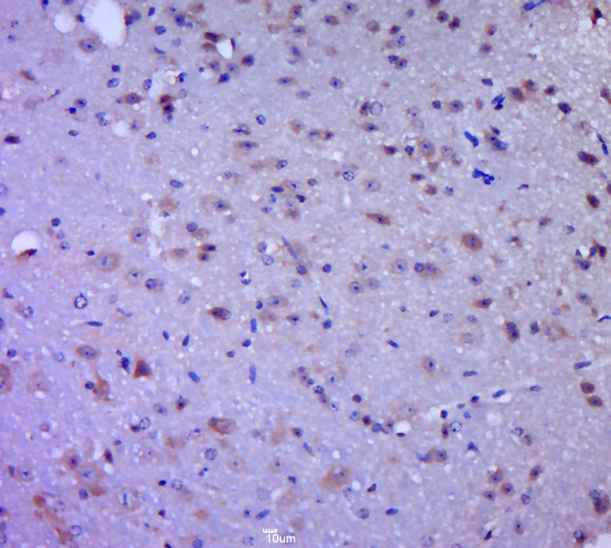 Paraformaldehyde-fixed, paraffin embedded (mouse brain tissue); Antigen retrieval by boiling in sodium citrate buffer (pH6.0) for 15min; Block endogenous peroxidase by 3% hydrogen peroxide for 20 minutes; Blocking buffer (normal goat serum) at 37°C for 30min; Antibody incubation with (CNOT6) Polyclonal Antibody, Unconjugated (bs-20636R) at 1:400 overnight at 4°C, followed by a conjugated secondary (sp-0023) for 20 minutes and DAB staining.
