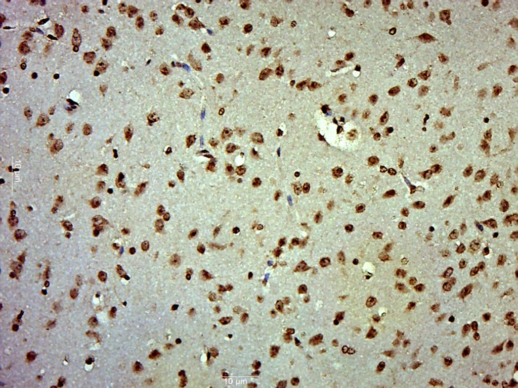 Paraformaldehyde-fixed, paraffin embedded (Mouse brain); Antigen retrieval by boiling in sodium citrate buffer (pH6.0) for 15min; Block endogenous peroxidase by 3% hydrogen peroxide for 20 minutes; Blocking buffer (normal goat serum) at 37°C for 30min; Antibody incubation with (C-RAF) Polyclonal Antibody, Unconjugated (bs-23170R) at 1:500 overnight at 4°C, followed by a conjugated secondary (sp-0023) for 20 minutes and DAB staining.