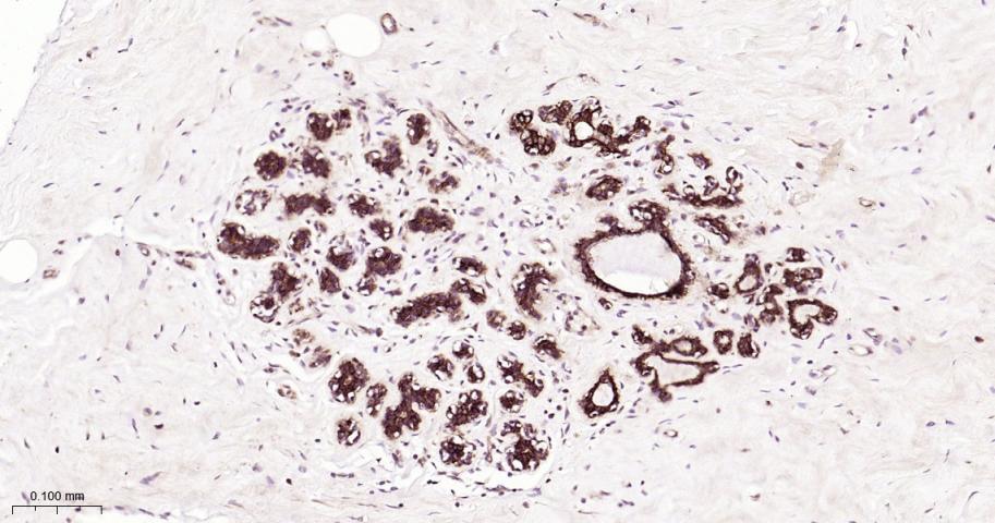 Paraformaldehyde-fixed, paraffin embedded Human breast; Antigen retrieval by boiling in sodium citrate buffer (pH6.0) for 15 min; Antibody incubation with CK18  Monoclonal Antibody, Unconjugated(bsm-52058R) at 1:200 overnight at 4°C, followed by conjugati