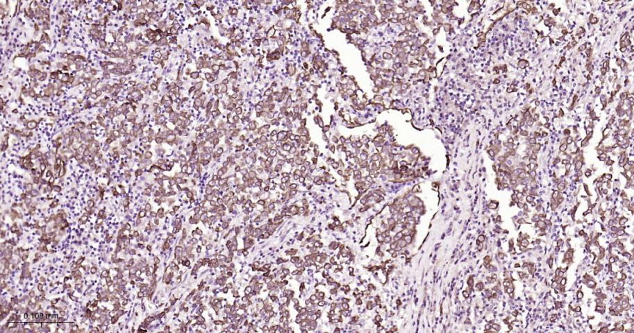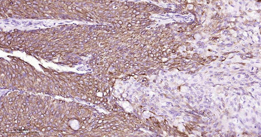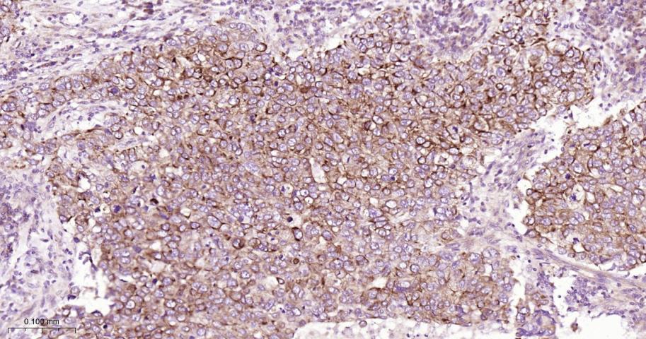 Paraformaldehyde-fixed, paraffin embedded Human kidney cancer; Antigen retrieval by boiling in sodium citrate buffer (pH6.0) for 15 min; Antibody incubation with CK18  Monoclonal Antibody, Unconjugated(bsm-52058R) at 1:200 overnight at 4°C, followed by co