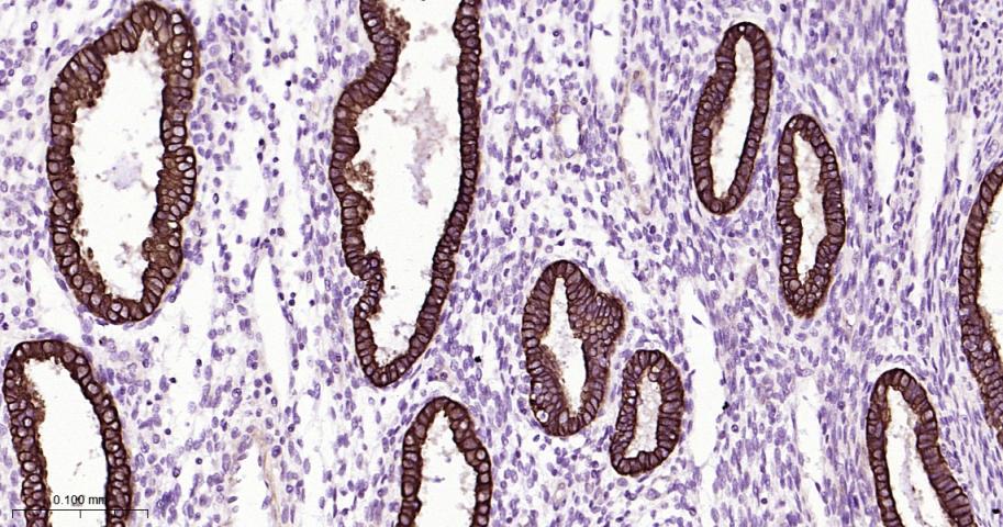 Paraformaldehyde-fixed, paraffin embedded Human endometrium; Antigen retrieval by boiling in sodium citrate buffer (pH6.0) for 15 min; Antibody incubation with CK18 Monoclonal Antibody, Unconjugated(bsm-52058R) at 1:200 overnight at 4°C, followed by conju