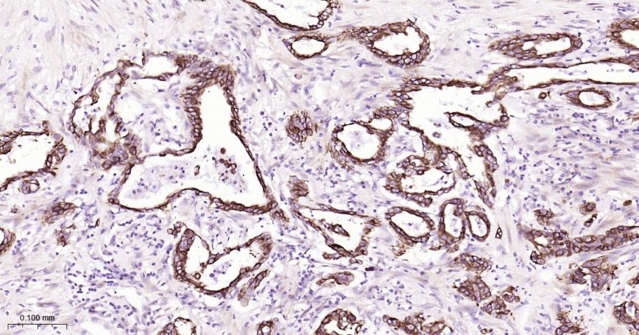 Paraformaldehyde-fixed, paraffin embedded Human pancreatic cancer; Antigen retrieval by boiling in sodium citrate buffer (pH6.0) for 15 min; Antibody incubation with CK18  Monoclonal Antibody, Unconjugated(bsm-52058R) at 1:200 overnight at 4°C, followed b