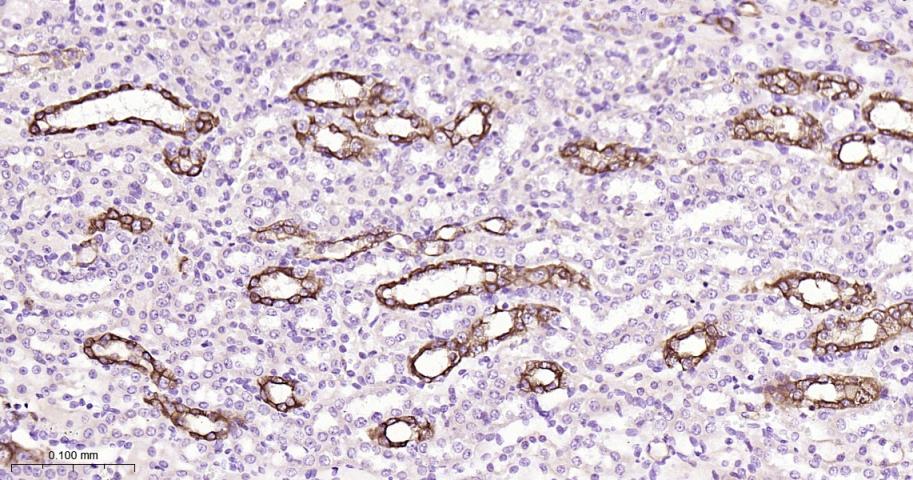 Paraformaldehyde-fixed, paraffin embedded Rat kidney; Antigen retrieval by boiling in sodium citrate buffer (pH6.0) for 15 min; Antibody incubation with CK18  Monoclonal Antibody, Unconjugated(bsm-52058R) at 1:200 overnight at 4°C, followed by conjugation