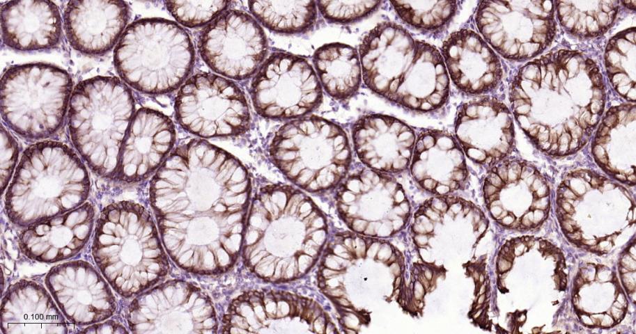 Paraformaldehyde-fixed, paraffin embedded Human colon; Antigen retrieval by boiling in sodium citrate buffer (pH6.0) for 15 min; Antibody incubation with CK18  Monoclonal Antibody, Unconjugated(bsm-52058R) at 1:200 overnight at 4°C, followed by conjugatio