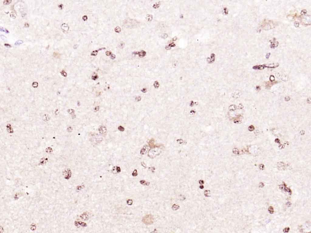 Paraformaldehyde-fixed, paraffin embedded (human brain); Antigen retrieval by boiling in sodium citrate buffer (pH6.0) for 15min; Block endogenous peroxidase by 3% hydrogen peroxide for 20 minutes; Blocking buffer (normal goat serum) at 37°C for 30min; Antibody incubation with (BMAL1) Polyclonal Antibody, Unconjugated (bs-22927R ) at 1:200 overnight at 4°C, followed by operating according to SP Kit(Rabbit) (sp-0023) instructionsand DAB staining.