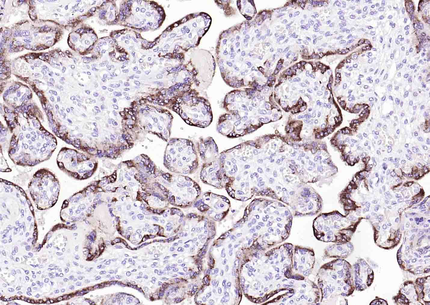 Paraformaldehyde-fixed, paraffin embedded (human placenta); Antigen retrieval by boiling in sodium citrate buffer (pH6.0) for 15min; Block endogenous peroxidase by 3% hydrogen peroxide for 20 minutes; Blocking buffer (normal goat serum) at 37°C for 30min; Incubation with (Human CGA) Monoclonal Antibody, Unconjugated (V2706) at 1:200 overnight at 4°C, followed by operating according to SP Kit(Mouse)(sp-0024) instructionsand DAB staining.