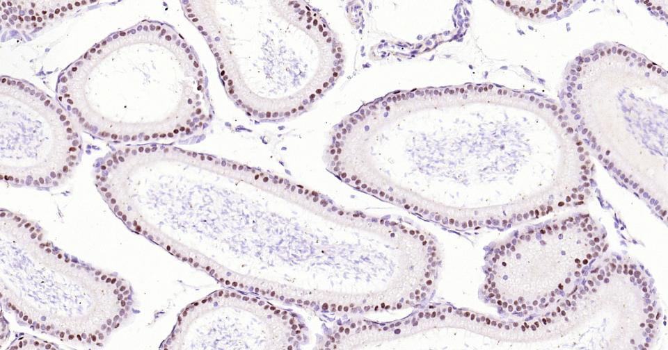 Paraformaldehyde-fixed, paraffin embedded Mouse Epididymis; Antigen retrieval by boiling in sodium citrate buffer (pH6.0) for 15 min; Antibody incubation with SOX9 Monoclonal Antibody, Unconjugated(bsm-63031R) at 1:400 overnight at 4°C, followed by conjugation to the bs-0295G-HRP and DAB (C-0010) staining.