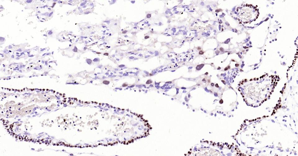 Paraformaldehyde-fixed, paraffin embedded Rat Placenta; Antigen retrieval by boiling in sodium citrate buffer (pH6.0) for 15 min; Antibody incubation with SOX9 Monoclonal Antibody, Unconjugated(bsm-63031R) at 1:400 overnight at 4°C, followed by conjugation to the bs-0295G-HRP and DAB (C-0010) staining.