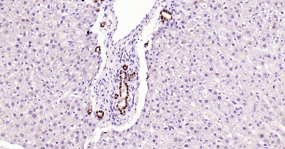 Paraformaldehyde-fixed, paraffin embedded Rat Liver; Antigen retrieval by boiling in sodium citrate buffer (pH6.0) for 15 min; Antibody incubation with SOX9 Monoclonal Antibody, Unconjugated(bsm-63031R) at 1:400 overnight at 4°C, followed by conjugation to the bs-0295G-HRP and DAB (C-0010) staining.