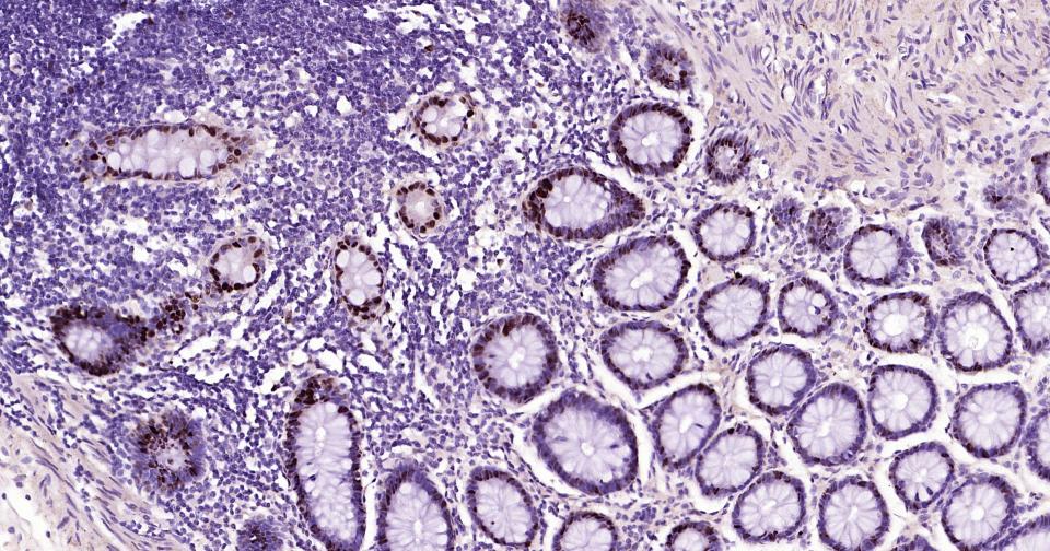 Paraformaldehyde-fixed, paraffin embedded Human Colon; Antigen retrieval by boiling in sodium citrate buffer (pH6.0) for 15 min; Antibody incubation with SOX9 Monoclonal Antibody, Unconjugated(bsm-63031R) at 1:400 overnight at 4°C, followed by conjugation to the bs-0295G-HRP and DAB (C-0010) staining.