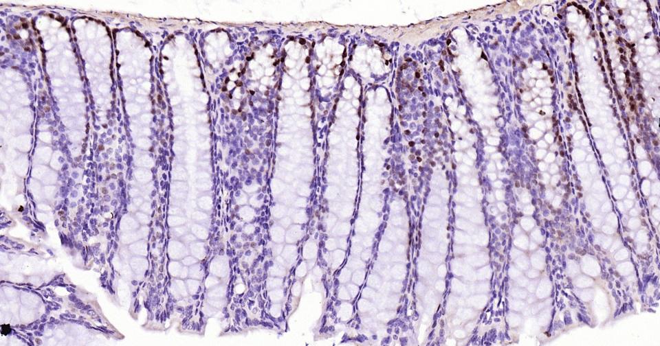 Paraformaldehyde-fixed, paraffin embedded Mouse Colon; Antigen retrieval by boiling in sodium citrate buffer (pH6.0) for 15 min; Antibody incubation with SOX9 Monoclonal Antibody, Unconjugated(bsm-63031R) at 1:400 overnight at 4°C, followed by conjugation to the bs-0295G-HRP and DAB (C-0010) staining.