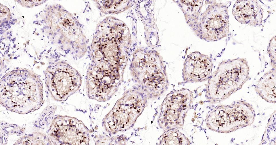 Paraformaldehyde-fixed, paraffin embedded Rat testis; Antigen retrieval by boiling in sodium citrate buffer (pH6.0) for 15 min; Antibody incubation with SOX9 Monoclonal Antibody, Unconjugated(bsm-63031R) at 1:400 overnight at 4°C, followed by conjugation to the SP Kit (Rabbit, SP-0023)and DAB (C-0010) staining.