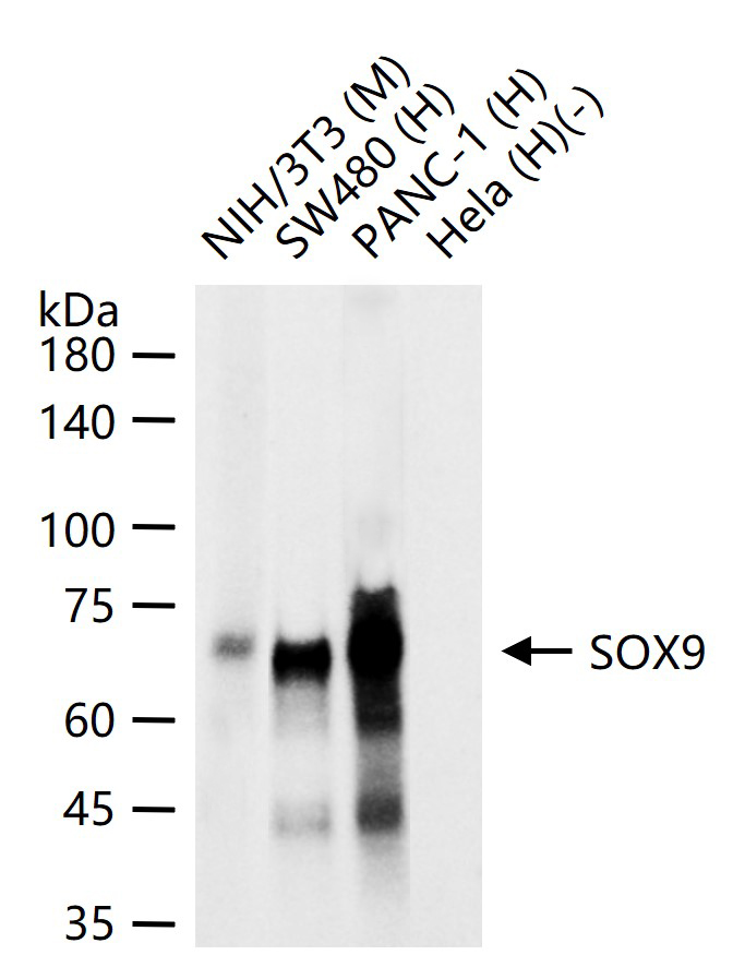 25 ug total protein per lane of various lysates (see on figure) probed with SOX9 monoclonal antibody, unconjugated (bsm-63031R) at 1:2000 dilution and 4°C overnight incubation. Followed by conjugated secondary antibody incubation at r.t. for 60 min.