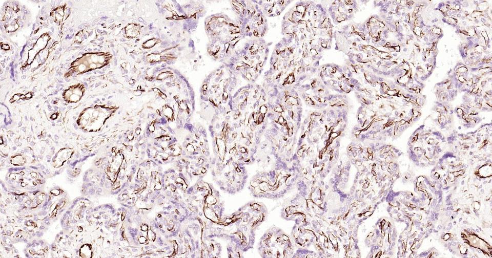 Paraformaldehyde-fixed, paraffin embedded Human Placenta; Antigen retrieval by boiling in sodium citrate buffer (pH6.0) for 15 min; Antibody incubation with VEGFA Monoclonal Antibody, Unconjugated(bsm-63036R) at 1:200 overnight at 4°C, followed by conjugation to the SP Kit (Rabbit, SP-0023)and DAB (C-0010) staining.