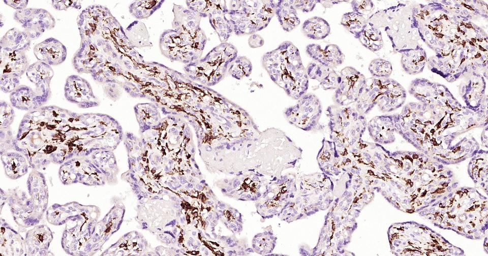 Paraformaldehyde-fixed, paraffin embedded Human Placenta; Antigen retrieval by boiling in sodium citrate buffer (pH6.0) for 15 min; Antibody incubation with CD163 Monoclonal Antibody, Unconjugated(bsm-63033R) at 1:200 overnight at 4°C, followed by conjugation to the SP Kit (Rabbit, SP-0023)and DAB (C-0010) staining.