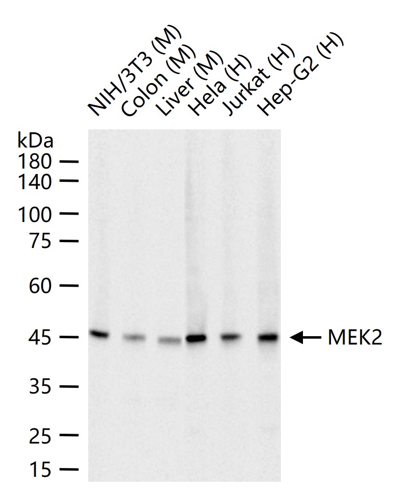 25 ug total protein per lane of various lysates (see on figure) probed with MEK2 monoclonal antibody, unconjugated (bsm-63042R) at 1:1000 dilution and 4°C overnight incubation. Followed by conjugated secondary antibody incubation at r.t. for 60 min.