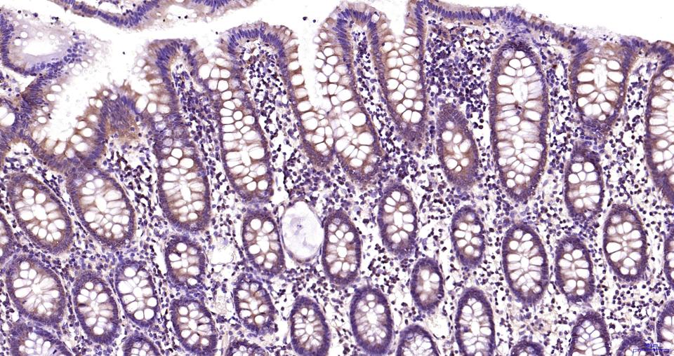 Paraformaldehyde-fixed, paraffin embedded Human colon; Antigen retrieval by boiling in sodium citrate buffer (pH6.0) for 15 min; Antibody incubation with MEK2 Monoclonal Antibody, Unconjugated (bsm-63042R) at 1:200 overnight at 4°C, followed by conjugation to the bs-0295G-HRP and DAB (C-0010) staining.