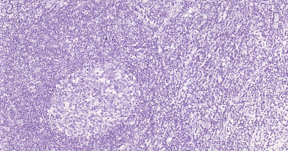 (Negative control) Paraformaldehyde-fixed, paraffin embedded Human Tonsil; Antigen retrieval by boiling in sodium citrate buffer (pH6.0) for 15 min; Antibody incubation alpha Internexin? Monoclonal Antibody, Unconjugated(bsm-54173R) at 1:200 overnight at 4°C, followed by conjugation to the bs-0295G-HRP and DAB (C-0010) staining.