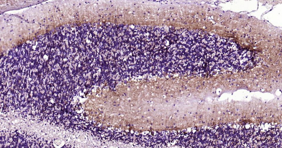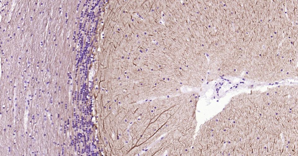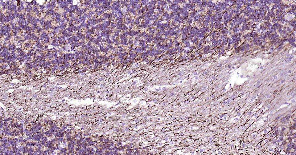 Paraformaldehyde-fixed, paraffin embedded Mouse Cerebellum; Antigen retrieval by boiling in sodium citrate buffer (pH6.0) for 15 min; Antibody incubation alpha Internexin? Monoclonal Antibody, Unconjugated(bsm-54173R) at 1:200 overnight at 4°C, followed by conjugation to the bs-0295G-HRP and DAB (C-0010) staining.