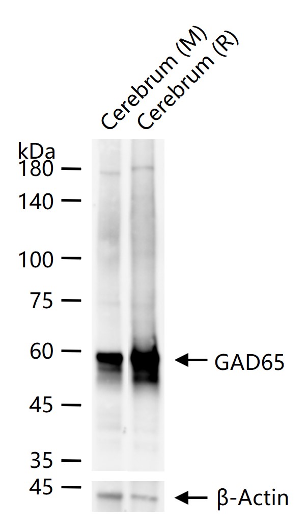 25 ug total protein per lane of various lysates (see on figure) probed with GAD65 polyclonal antibody, unconjugated (bs-60890R) at 1:1000 dilution and 4°C overnight incubation. Followed by conjugated secondary antibody incubation at r.t. for 60 min.