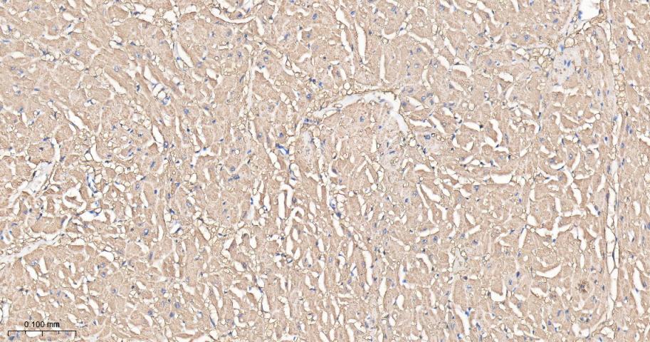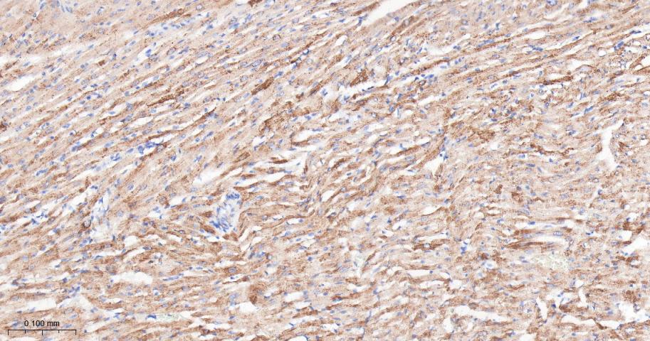Paraformaldehyde-fixed, paraffin embedded Human Heart; Antigen retrieval by boiling in sodium citrate buffer (pH6.0) for 15 min; Antibody incubation with Aspartate Aminotransferase Monoclonal Antibody, Unconjugated(bsm-63078R) at 1:200 overnight at 4°C, followed by conjugation to the bs-0295G-HRP and DAB (C-0010) staining.