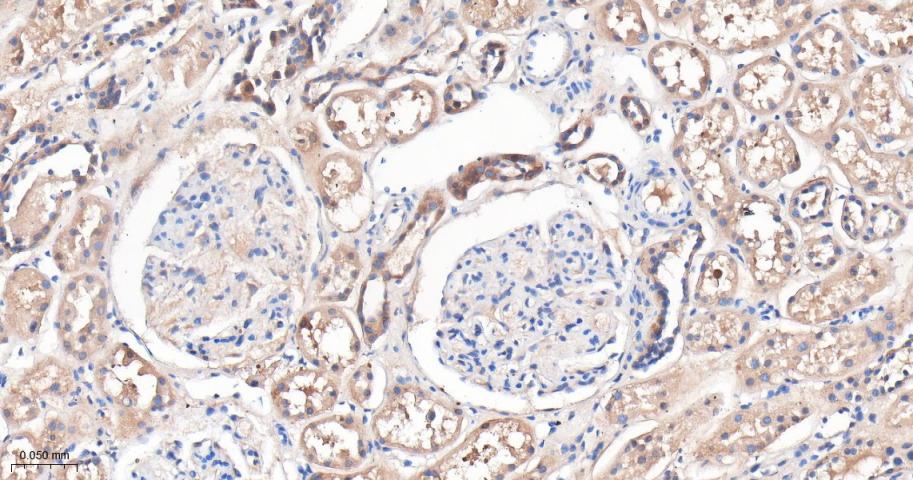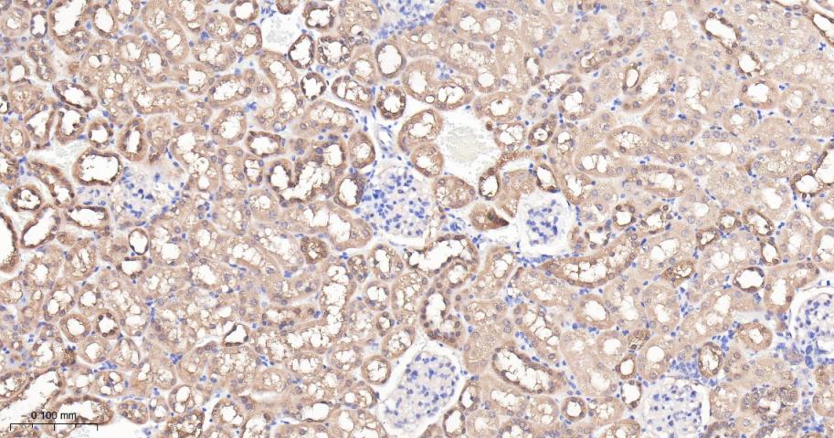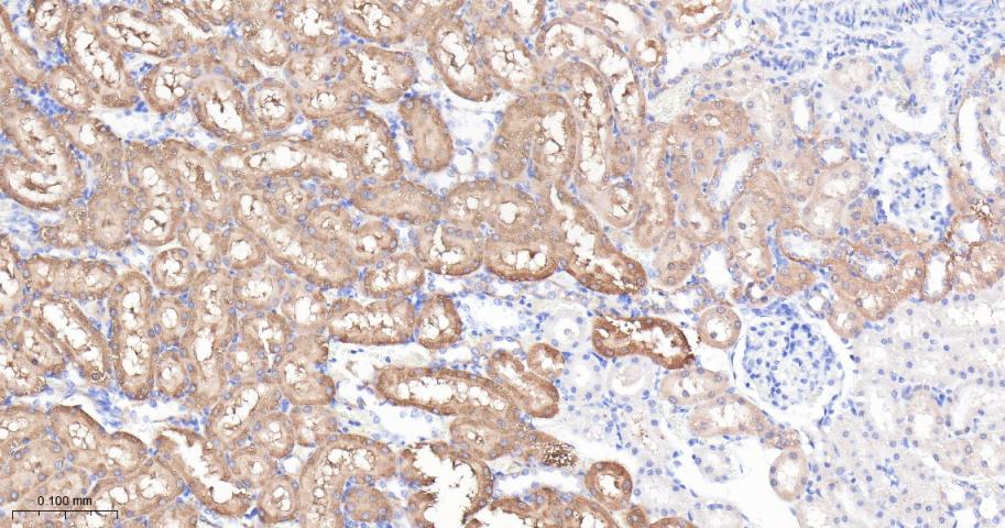 Paraformaldehyde-fixed, paraffin embedded Mouse Kidney; Antigen retrieval by boiling in sodium citrate buffer (pH6.0) for 15 min; Antibody incubation with Aspartate Aminotransferase Monoclonal Antibody, Unconjugated(bsm-63078R) at 1:200 overnight at 4°C, followed by conjugation to the bs-0295G-HRP and DAB (C-0010) staining.