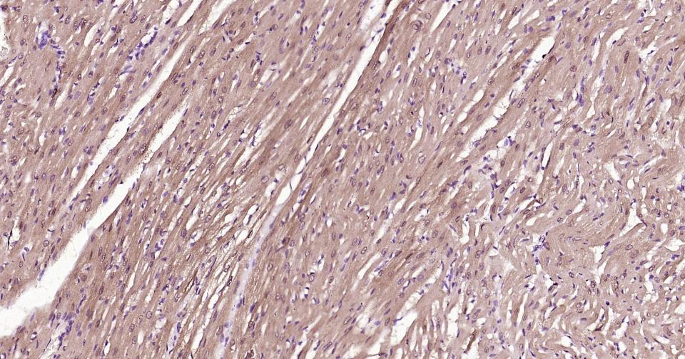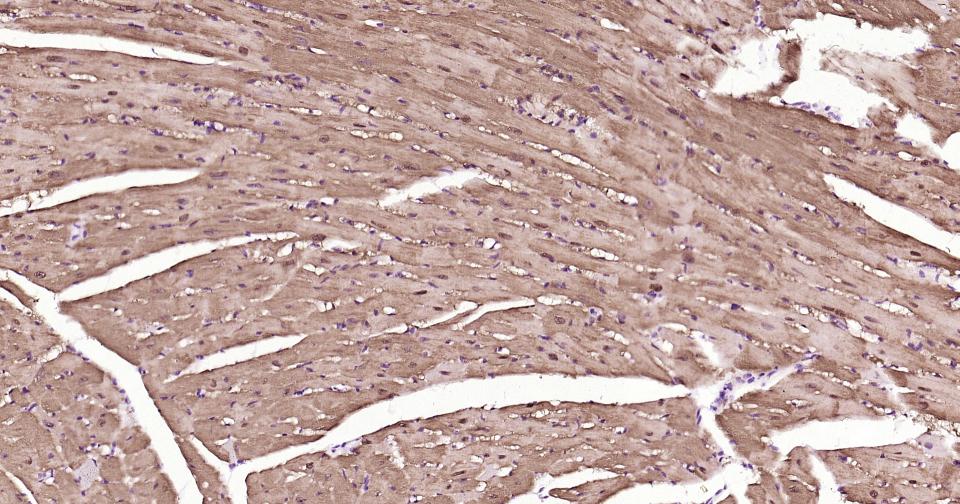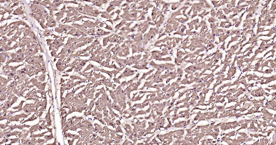 Paraformaldehyde-fixed, paraffin embedded Human Heart; Antigen retrieval by boiling in sodium citrate buffer (pH6.0) for 15 min; Antibody incubation with S100A1 Monoclonal Antibody, Unconjugated(bsm-63045R) at 1:200 overnight at 4°C, followed by conjugation to the bs-0295G-HRP and DAB (C-0010) staining.