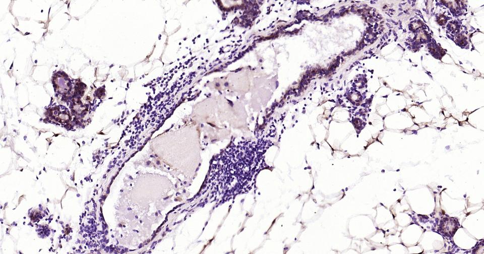 Paraformaldehyde-fixed, paraffin embedded Mouse Breast; Antigen retrieval by boiling in sodium citrate buffer (pH6.0) for 15 min; Antibody incubation with S100A1 Monoclonal Antibody, Unconjugated(bsm-63045R) at 1:200 overnight at 4°C, followed by conjugation to the bs-0295G-HRP and DAB (C-0010) staining.