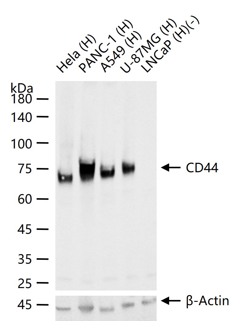 25 ug total protein per lane of various lysates (see on figure) probed with CD44 monoclonal antibody, unconjugated (bsm-63050R) at 1:1000 dilution and 4°C overnight incubation. Followed by conjugated secondary antibody incubation at r.t. for 60 min.