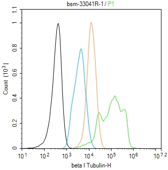 The HepG2 (H) cells were fixed with 4% PFA (10 min at r.t.) and then permeabilized with 90% ice-cold methanol for 20 min at -20℃,the cells then were incubated in 5%BSA to block non-specific protein-protein interactions (30 min at r.t.).Primary Antibody (green):Rabbit Anti-beta I Tubulin antibody (bsm-33041R): 1 μg/10^6 cells; Secondary Antibody (white blue): Goat anti-Rabbit IgG-BF488 (bs-60295G-BF488): 1 μg/test. Isotype Control (orange): Rabbit IgG (bs-0295P). Blank control (black): PBS. Acquisition of 20,000 events was performed.