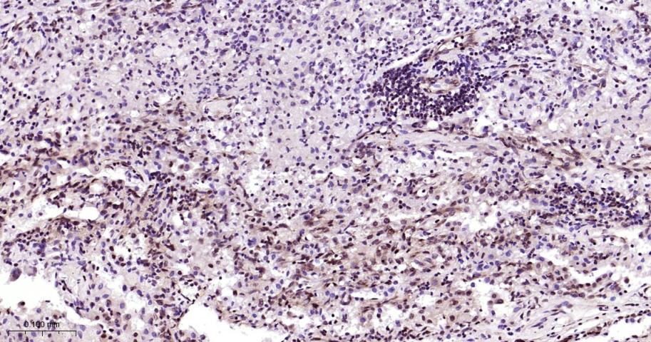 Paraformaldehyde-fixed, paraffin embedded Human Lung Cancer; Antigen retrieval by boiling in sodium citrate buffer (pH6.0) for 15 min; Antibody incubation with Phospho-mTOR(S2481) Monoclonal Antibody, Unconjugated(bsm-63079R) at 1:200 overnight at 4°C, followed by conjugation to the bs-0295G-HRP and DAB (C-0010) staining.