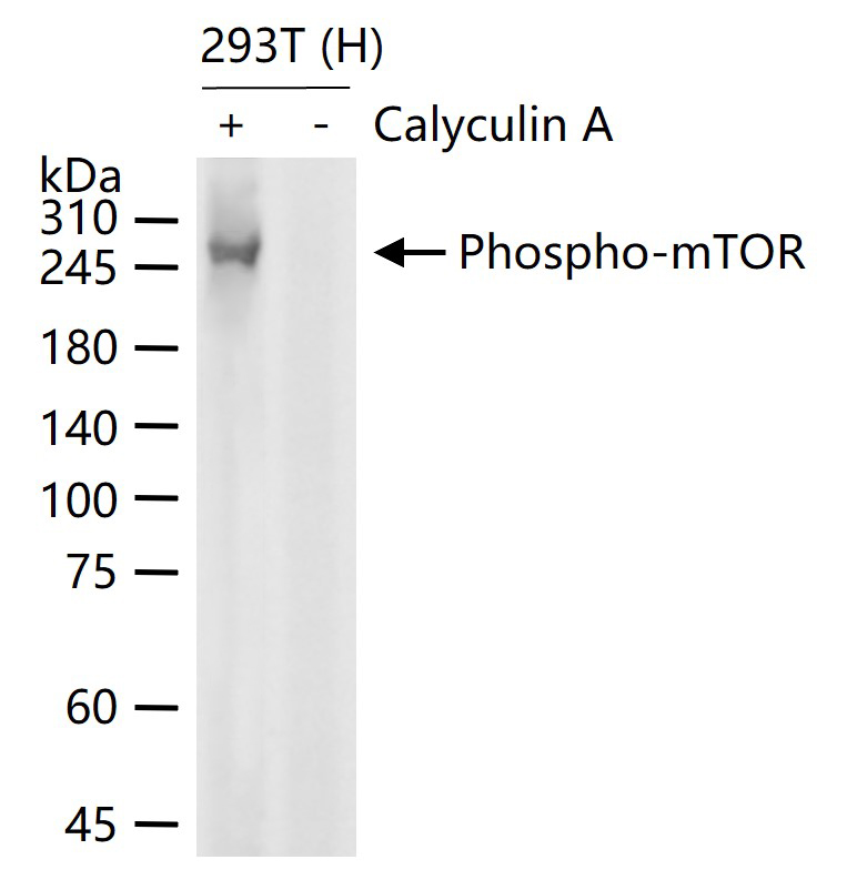 293T (H) cells were treated with or without Calyculin A (100 nM) for 60 min, 25 μg total protein per lane of cell lysates (see on figure) probed with Phospho-mTOR(S2481) monoclonal antibody, unconjugated (bsm-63079R) at 1:1000 dilution and 4°C overnight incubation. Followed by conjugated secondary antibody incubation at r.t. for 60 min.