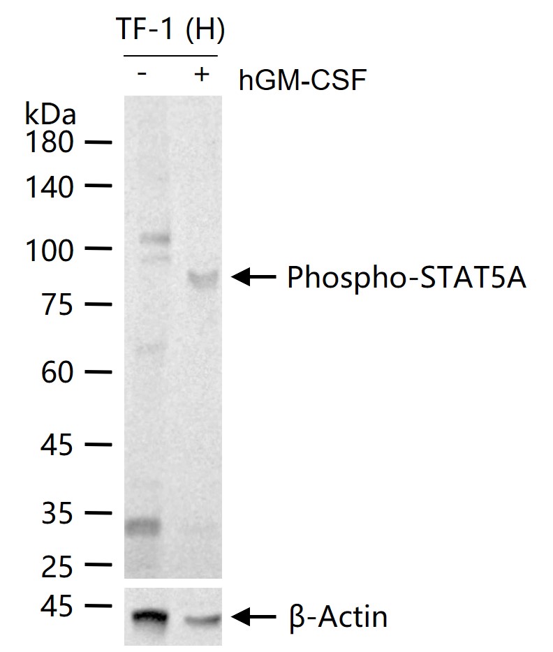 TF-1 (H) cells were treated with or without hGM-CSF (100ng/ml) for 10 min, 25 μg total protein per lane of cell lysates (see on figure) probed with Phospho-STAT5A (Y694) monoclonal antibody, unconjugated (bsm-54554R) at 1:1000 dilution and 4°C overnight incubation. Followed by conjugated secondary antibody incubation at r.t. for 60 min.