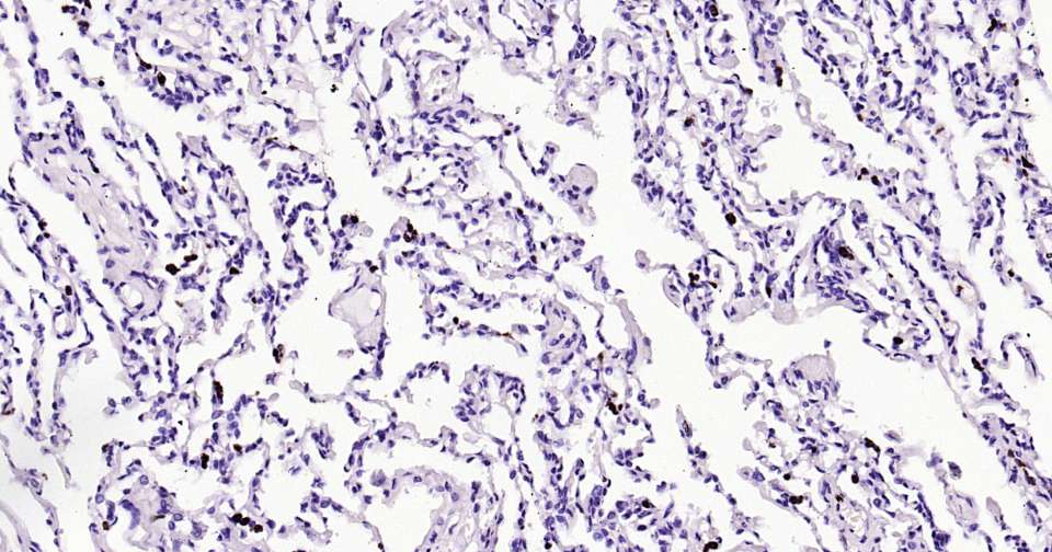 Immunohistochemical analysis of paraffin embedded human lung tissue slide using IHC0388H (Human Granzyme B Kit).