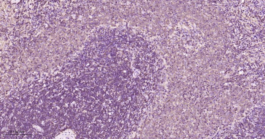 Paraformaldehyde-fixed, paraffin embedded Mouse spleen; Antigen retrieval by boiling in sodium citrate buffer (pH6.0) for 15 min; The section was incubated with PKC alpha Monoclonal Antibody, Unconjugated(bsm-63319R) at 1:200 overnight at 4°C, followed by conjugation to the bs-0295G-HRP and DAB (C-0010) staining.