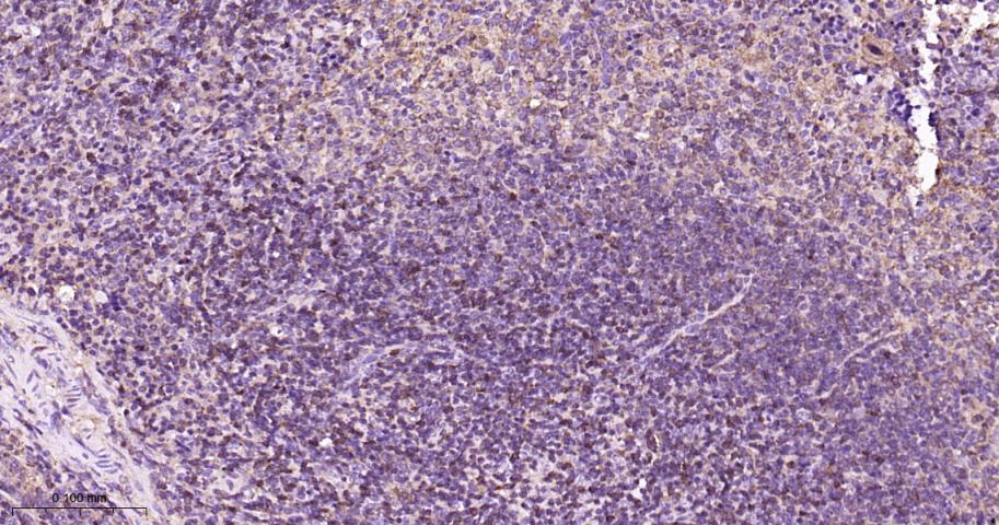 Paraformaldehyde-fixed, paraffin embedded Rat spleen; Antigen retrieval by boiling in sodium citrate buffer (pH6.0) for 15 min; The section was incubated with PKC alpha Monoclonal Antibody, Unconjugated(bsm-63319R) at 1:200 overnight at 4°C, followed by conjugation to the bs-0295G-HRP and DAB (C-0010) staining.