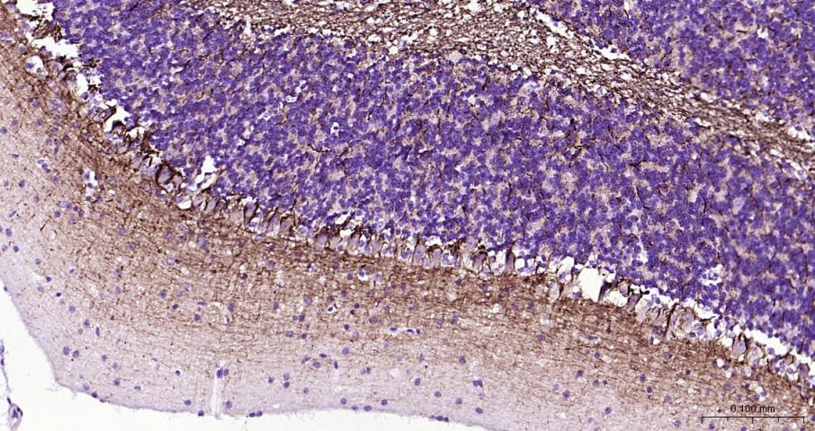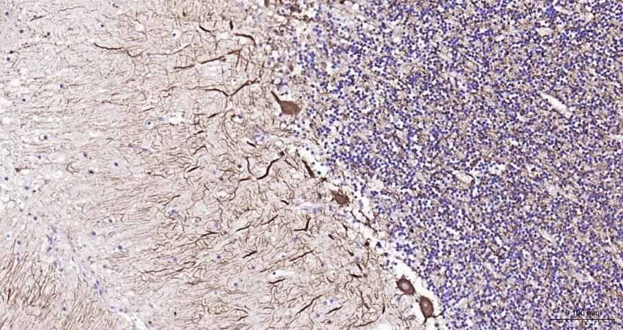 Paraformaldehyde-fixed, paraffin embedded Rat Cerebellum; Antigen retrieval by boiling in sodium citrate buffer (pH6.0) for 15 min; Antibody incubation with NF-L Monoclonal Antibody, Unconjugated(bsm-41217R) at 1:200 overnight at 4°C, followed by conjugation to the bs-0295G-HRP and DAB (C-0010) staining.