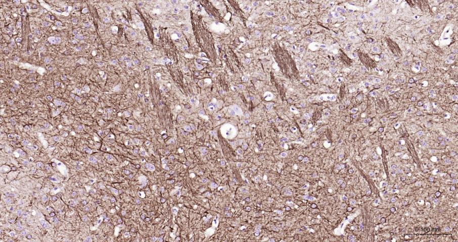 Paraformaldehyde-fixed, paraffin embedded Human Cerebrum; Antigen retrieval by boiling in sodium citrate buffer (pH6.0) for 15 min; Antibody incubation with NF-L Monoclonal Antibody, Unconjugated(bsm-41217R) at 1:200 overnight at 4°C, followed by conjugation to the bs-0295G-HRP and DAB (C-0010) staining.