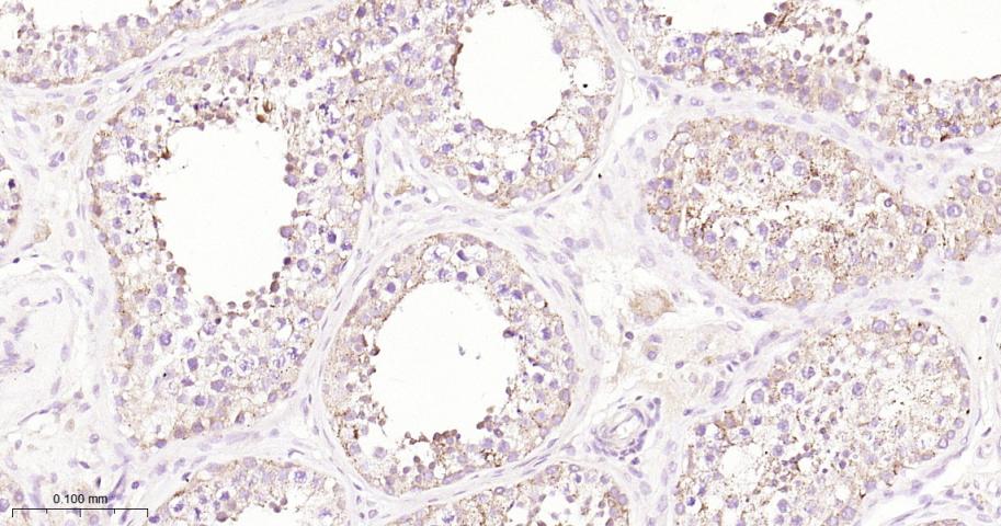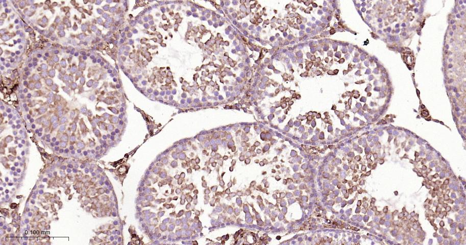 Paraformaldehyde-fixed, paraffin embedded Rat Testicles; Antigen retrieval by boiling in sodium citrate buffer (pH6.0) for 15 min; Antibody incubation with BRAF Monoclonal Antibody, Unconjugated(bsm-63118R) at 1:200 overnight at 4°C, followed by conjugation to the bs-0295G-HRP and DAB (C-0010) staining.