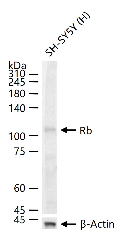 25 ug total protein per lane of various lysates (see on figure) probed with Rb monoclonal antibody, unconjugated (bsm-63143R) at 1:1000 dilution and 4°C overnight incubation. Followed by conjugated secondary antibody incubation at r.t. for 60 min.