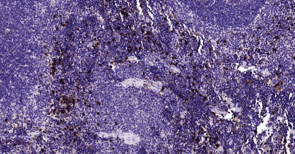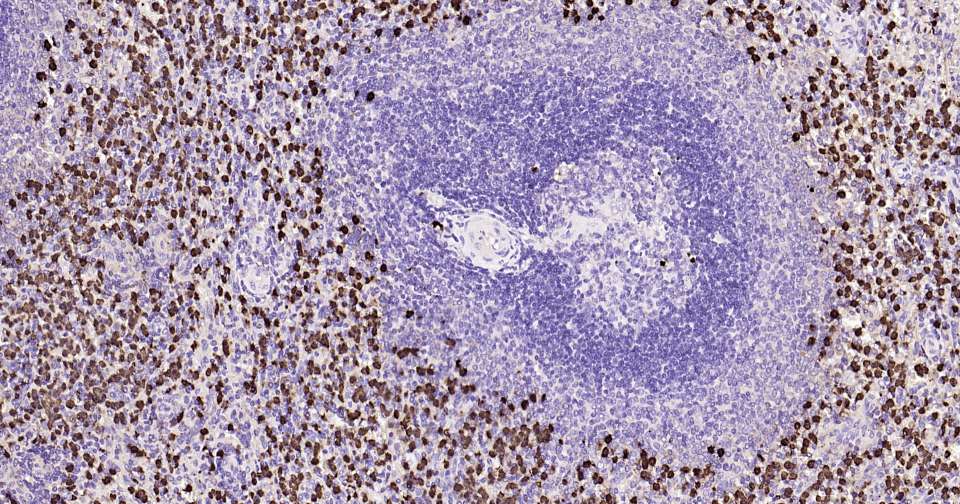 Immunohistochemical analysis of paraffin embedded human spleen tissue slide using IHC0335 (S100A8 Kit).