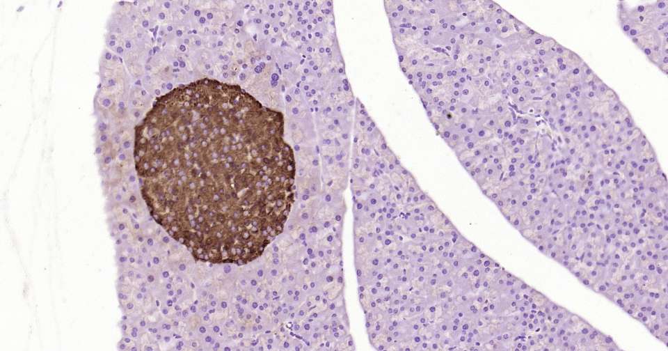 Immunohistochemical analysis of paraffin embedded mouse pancreas tissue slide using IHC0364 (Notch1 Kit).